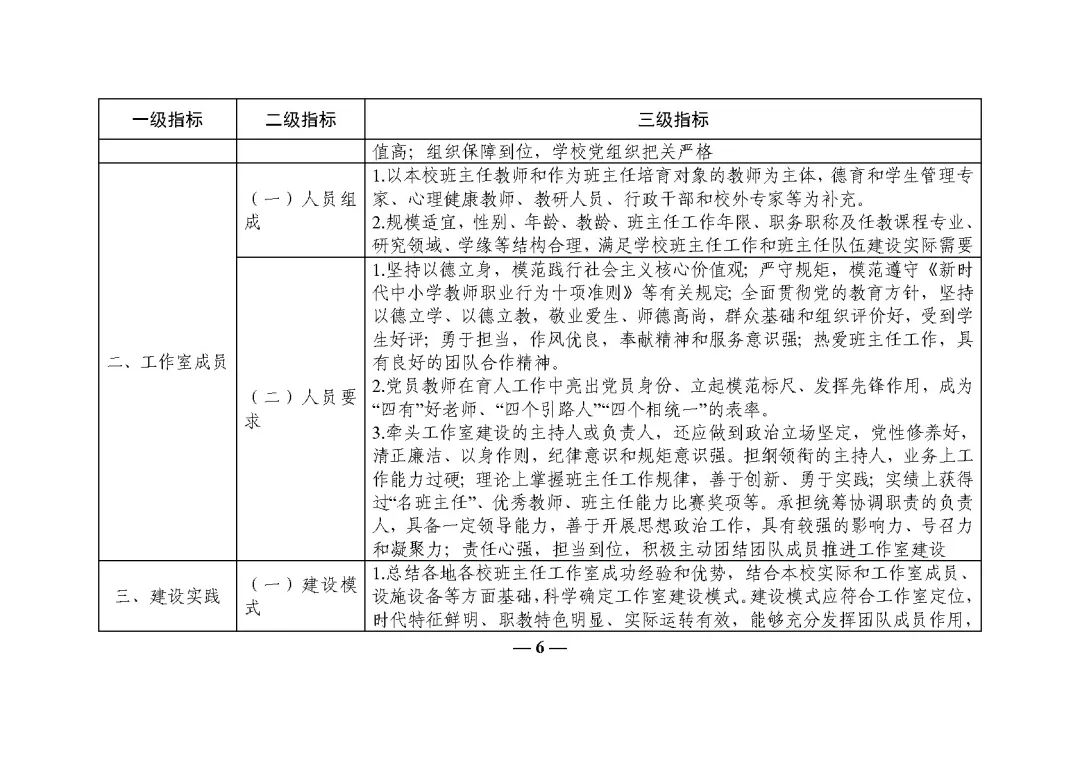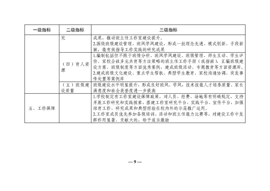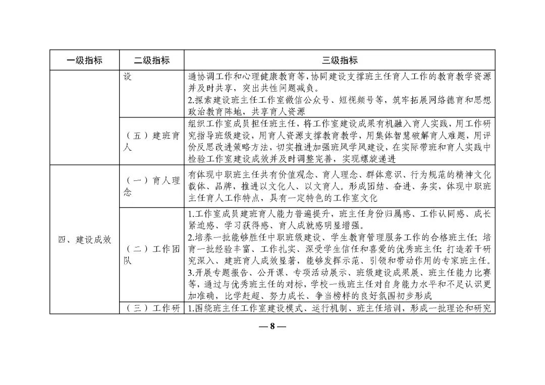 探索适应中职学生特点和技术技能人才成长规律的班主任工作室建设机制、方法,培育建设一批班主任工作室,推动各地各中职学校进一步提高班主任队伍专业化水平,建设一支优秀的班主任工作队伍。